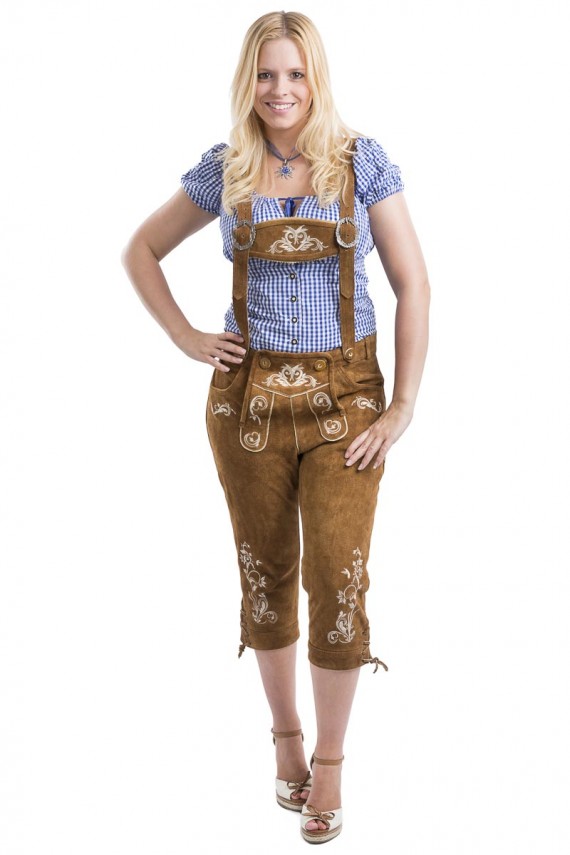 Die Kniebundtrachtenlederhose Capri ist aus hochwertigem Leder gefertigt und mit feinen Stickereien am Hosenlatz, Hosenbein, der Messertasche sowie dem Hosenträger versehen und im mittellangem Schnitt verarbeitet. Der Hosenbund kann mit Hilfe des Lederbändchens an die Größe optimal angepasst werden und verleiht der Hose dadurch den perfekten Tragekomfort. Das Modell Capri ist die perfekte Kniebundlederhose für Damen und eine super Alternative zum Dirndl.Produkteigenschaften: